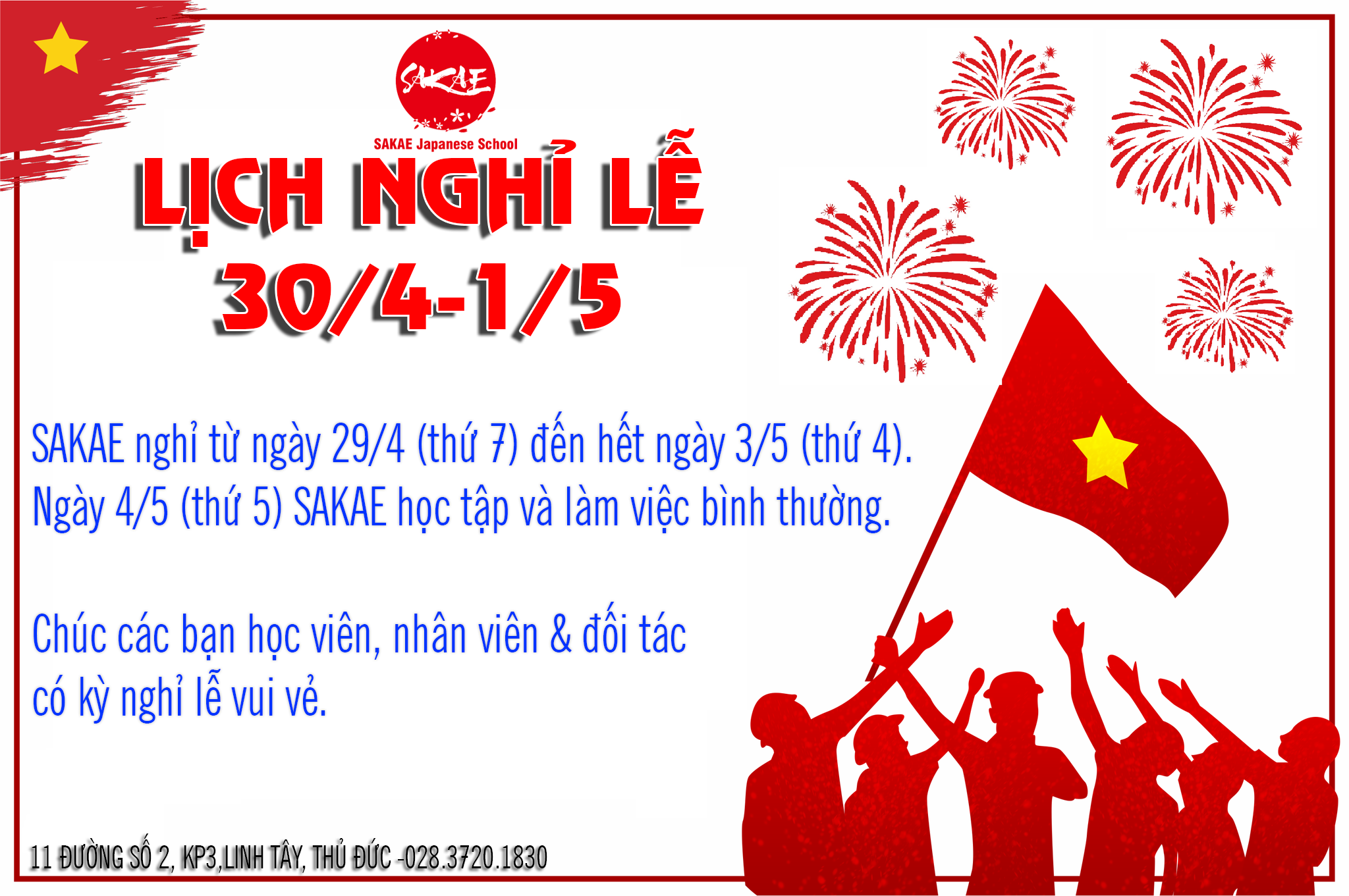 - Ngày 30/4 và 1/5: Sakae sẽ nghỉ từ 30/4 (chủ nhật) đến hết ngày 3/5 (thứ 4). Ngày 4/5 (thứ 5) Sakae sẽ hoạt động làm việc và học tập lại bình thường.