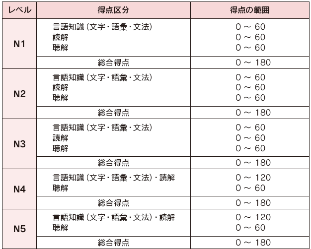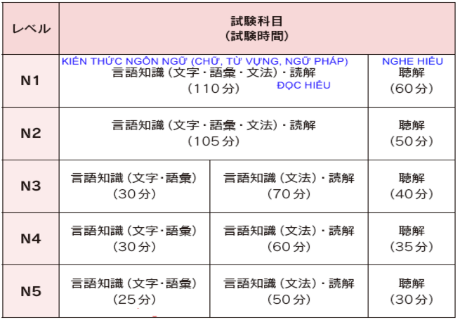 Cấp N1 và N2 thi kiến thức ngôn ngữ (chữ, từ vựng, ngữ pháp) và đọc hiểu là phổ biến. Còn N3, N4, N5 thì chia khiến 2 phần: Phần 1 là kiến thức ngôn ngữ gồm chữ, từ vựng; Phần 2 là kiến thức tiếng nói về ngữ pháp và đọc hiểu.